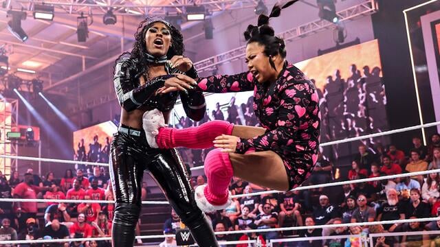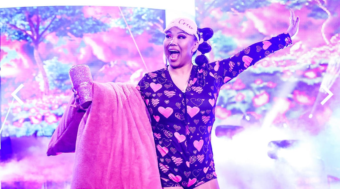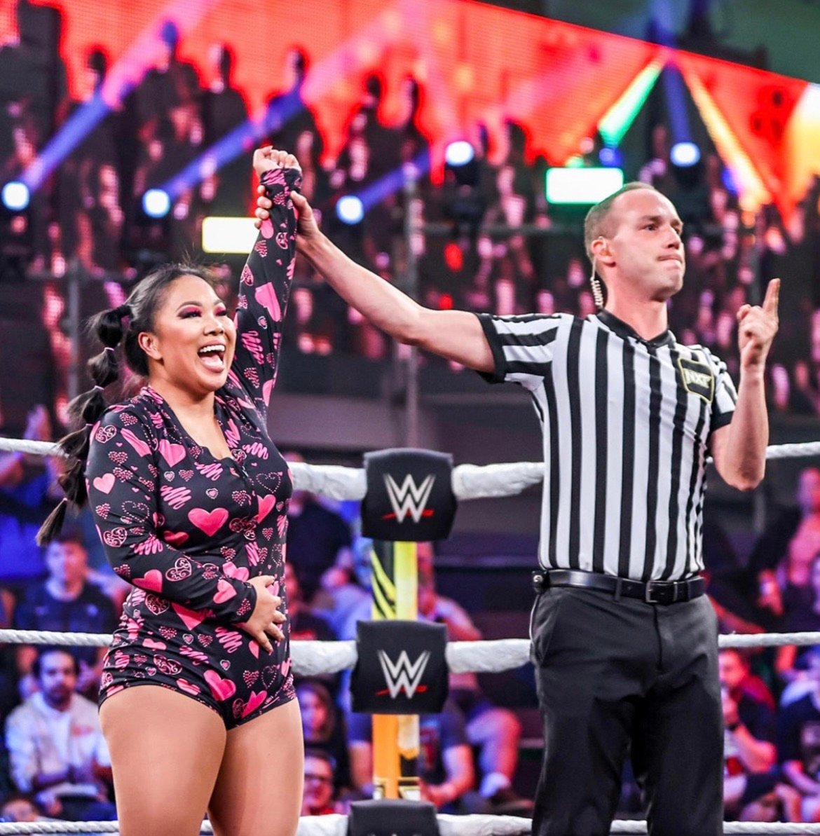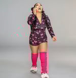 Black & Pink Hearts onesie set worn and signed by Wendy Choo. This purchase includes the onesie, sleep mask and leg sleeves. Onesie has been worn and featured on NXT TV. Wendy Choo wore this onesie on WWE NXT TV against Lash Legend and on Level Up against Kelani Jordan.