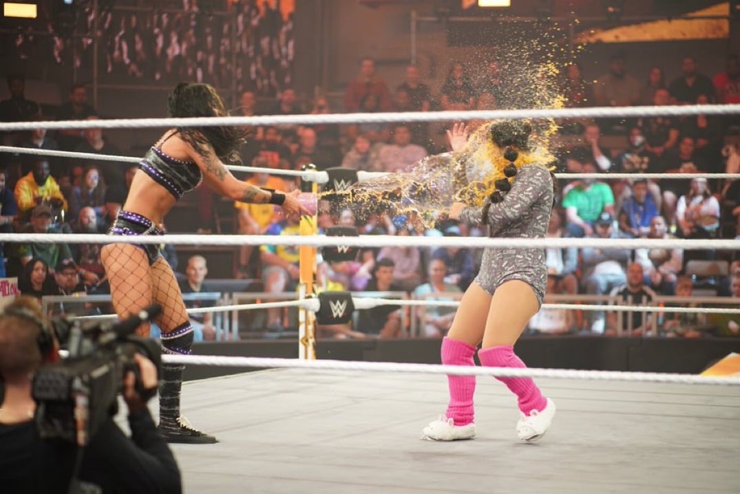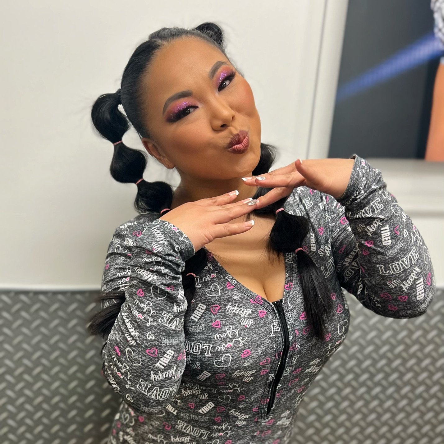 Gray Graphic onesie worn and signed by Wendy Choo. Onesie has been worn and featured on NXT TV. Wendy Choo wore this onesie on WWE NXT TV against Cora Jade and also in a Women's No. 1 Contender Battle Royal.